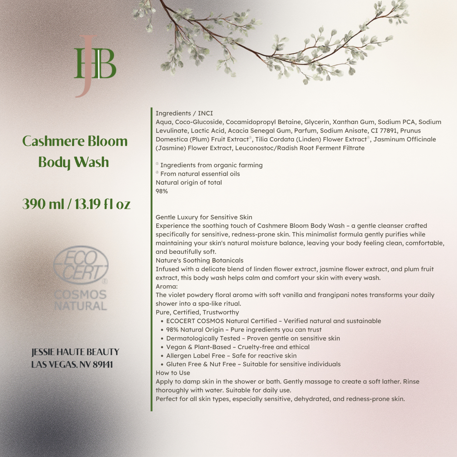Infused with a delicate blend of linden, jasmine, and plum fruit extracts, this body wash helps calm and comfort your skin with every wash.